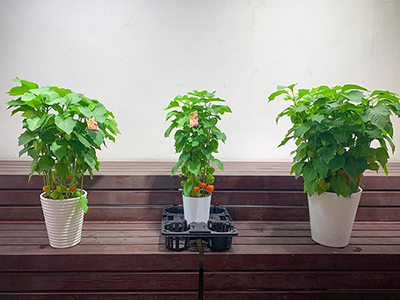 写真のホオズキは、切花品種を鉢で作っているため、ある程度の高さがある商品です。実付きもあり、色は現在まだ青いですが、お盆に向けて赤く色づいていきます。